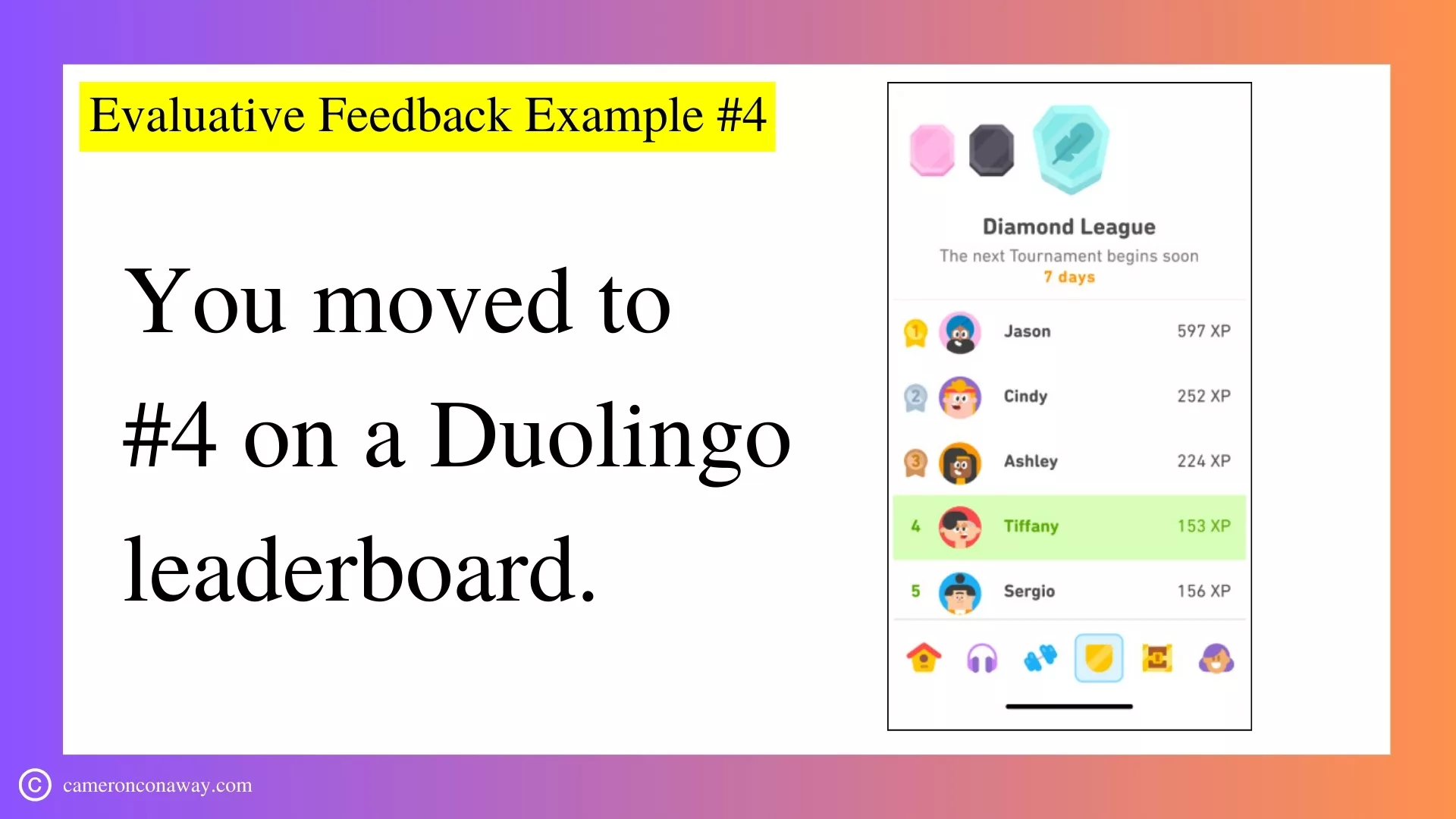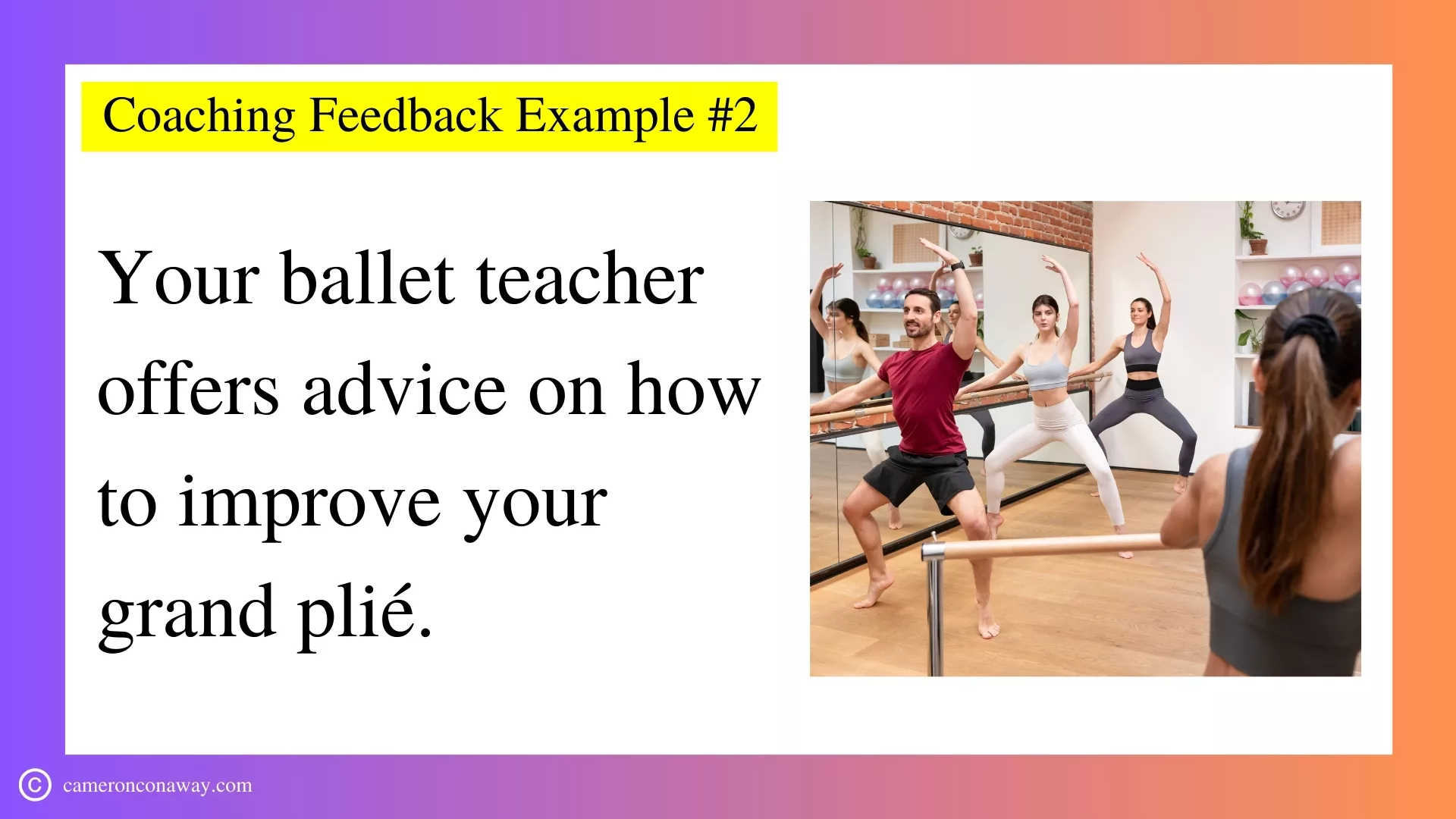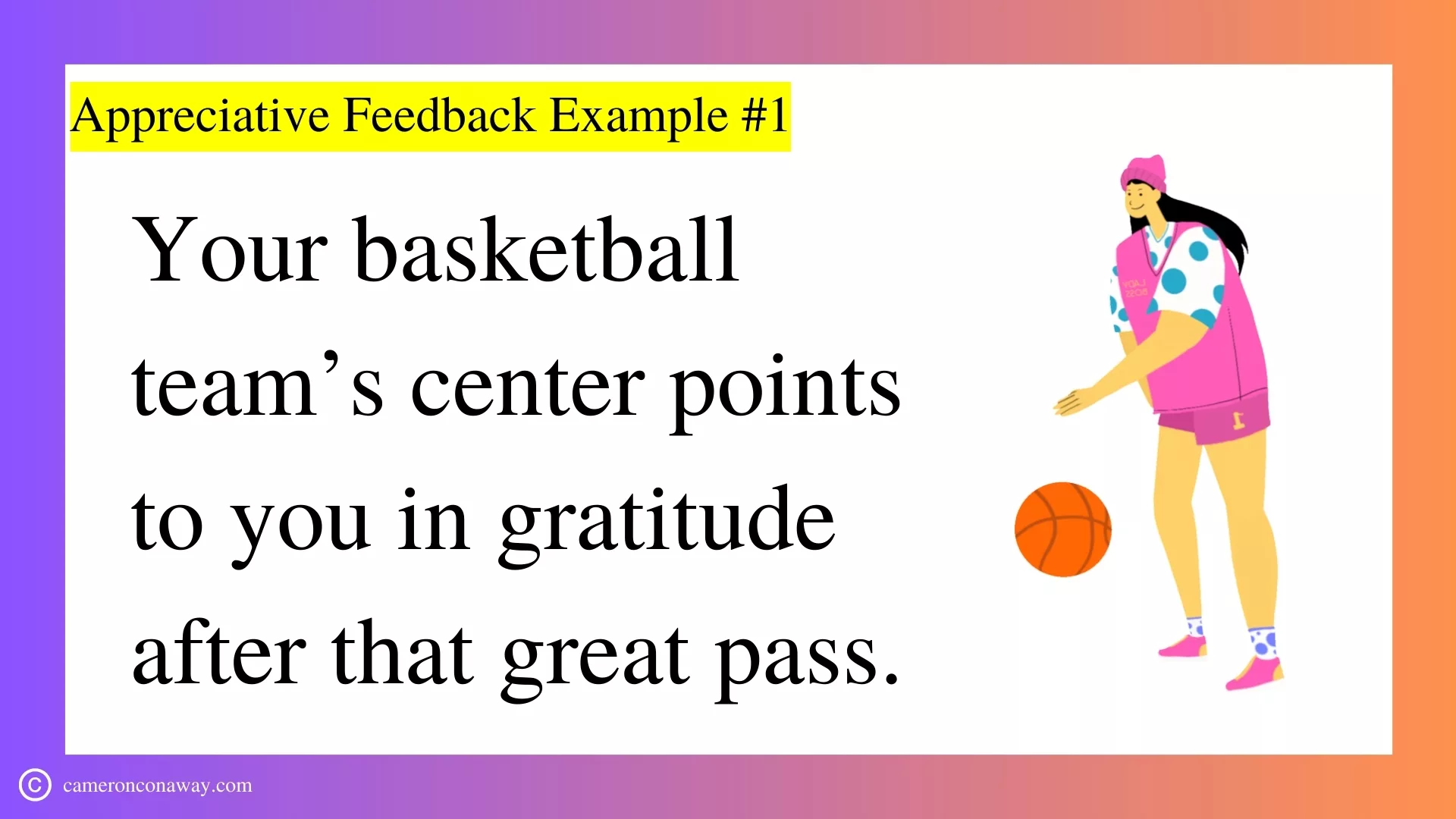 Evaluative Feedback Example Number One: At the end of the quarter, you drove 10% fewer marketing leads than you forecasted. Notice here it’s evaluative because it’s comparing the number of leads to a forecasted number. Number Two, A direct report tells you: “You are the best leader I’ve ever worked with.” Again, while this can also be appreciative, we could consider this evaluative because there’s an element of comparison. Number three, You did not meet the qualifying standards to participate in the Boston Marathon. Number four, You moved to #4 on a Duolingo leaderboard. Notice here the mix of verbal and nonverbal types… climbing the rankings on a leaderboard is feedback about how you’re doing against others. And number five, Your manager says you are in the top 5% percent of all performers. Moving on to Appreciative Feedback, Example one: Your basketball team’s center points to you in gratitude after that great pass. Number two: a colleague recognizes you in a Slack channel for going above and beyond. Number three: your teacher praises you in class for always asking great questions. Number four: Upon returning from a dangerous military mission, one sergeant hugs another. And number five: a patron at the restaurant where you work leaves you a great tip. Notice the importance here of appreciation – it not only feels good and can increase morale, but it also reinforces that you are doing something well… which is an important part of positive feedback, of understanding our strengths and improvements. Moving to Coaching feedback example number one: “Here’s what worked for me when I was in a similar position,” a colleague begins. Number two: Your ballet teacher offers advice on how to improve your grand plié. Number three: “The last two projects you managed went over budget. It wasn’t by much, but here are some principles I always put in place to ensure this doesn’t happen.” Number four: Through active listening and asking great questions, one teammate guides another to finding their own solution to a challenge. Notice here that peers can serve as coaches for each other. The coaching feedback type doesn’t always necessarily need to come from someone more skilled or experienced. And number five, “It’s clear you have a good sense of your weaknesses, but I wonder if you have a similar sense of your strengths. Are you open to exploring how we can bring those to this situation?” Notice also how the coaching feedback type can vary – ranging from very specific feedback to conversational guidance that in some way helps the feedback recipient see new perspectives or make better decisions.