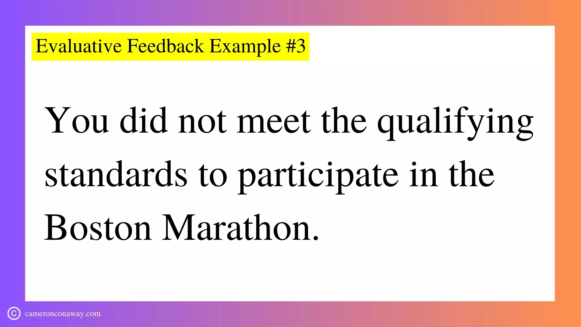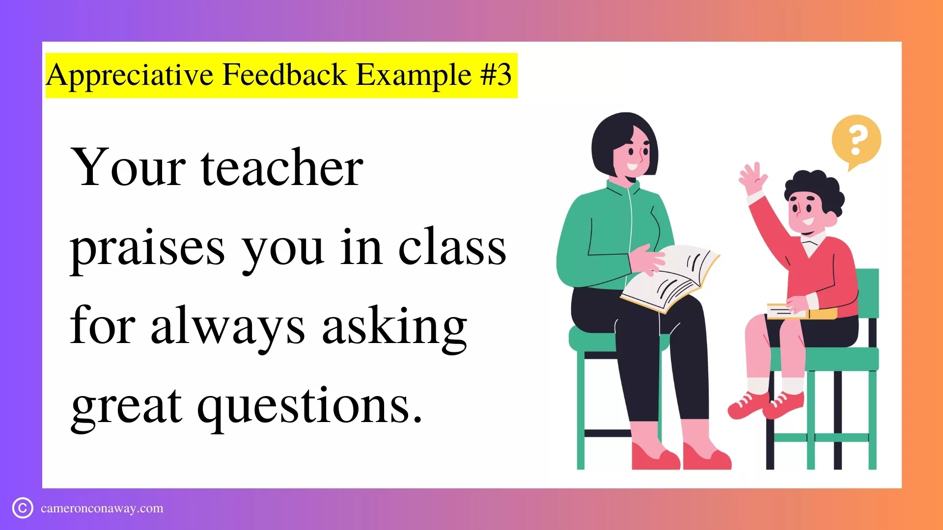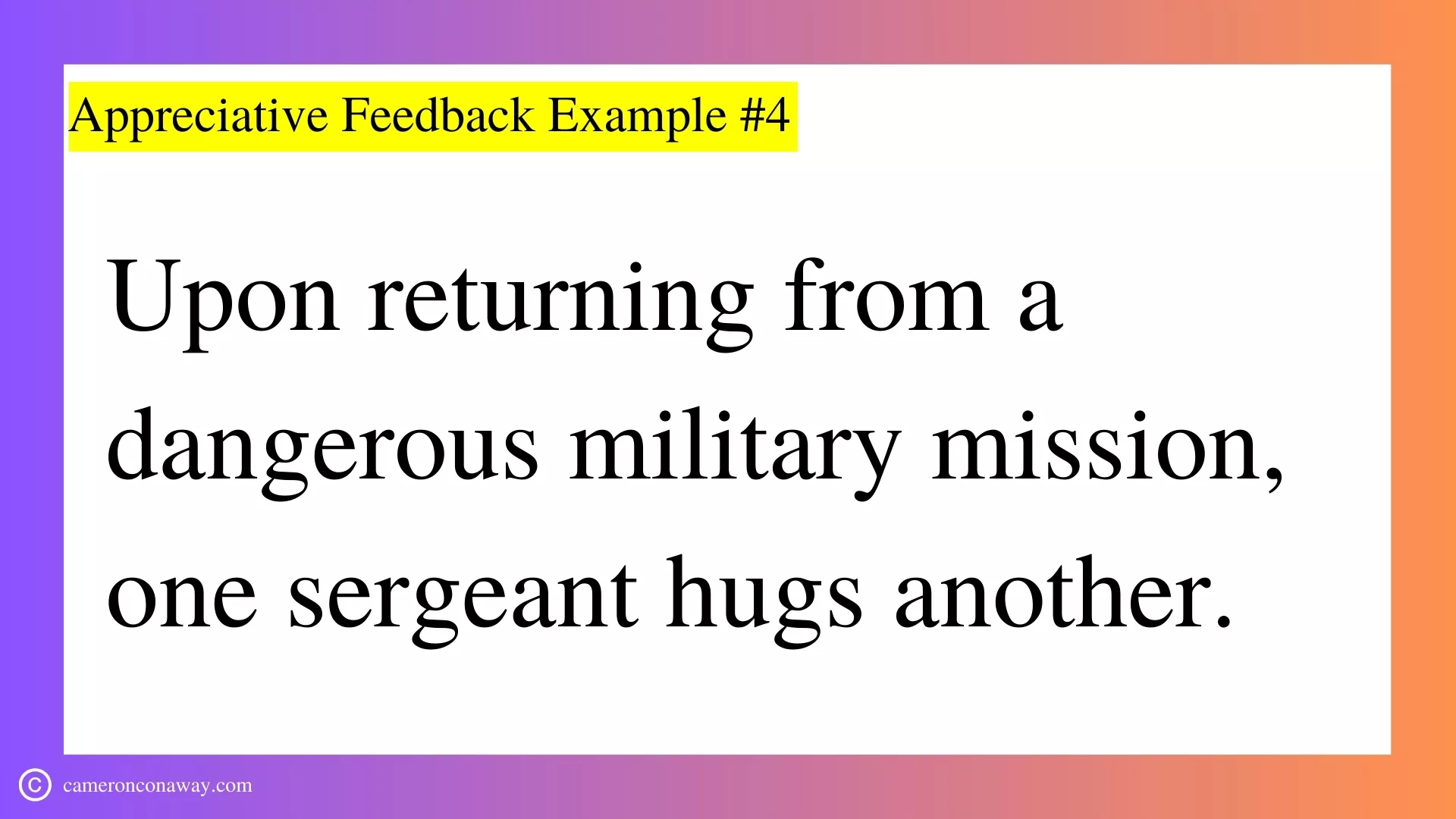 Evaluative Feedback Example Number One: At the end of the quarter, you drove 10% fewer marketing leads than you forecasted. Notice here it’s evaluative because it’s comparing the number of leads to a forecasted number. Number Two, A direct report tells you: “You are the best leader I’ve ever worked with.” Again, while this can also be appreciative, we could consider this evaluative because there’s an element of comparison. Number three, You did not meet the qualifying standards to participate in the Boston Marathon. Number four, You moved to #4 on a Duolingo leaderboard. Notice here the mix of verbal and nonverbal types… climbing the rankings on a leaderboard is feedback about how you’re doing against others. And number five, Your manager says you are in the top 5% percent of all performers. Moving on to Appreciative Feedback, Example one: Your basketball team’s center points to you in gratitude after that great pass. Number two: a colleague recognizes you in a Slack channel for going above and beyond. Number three: your teacher praises you in class for always asking great questions. Number four: Upon returning from a dangerous military mission, one sergeant hugs another. And number five: a patron at the restaurant where you work leaves you a great tip. Notice the importance here of appreciation – it not only feels good and can increase morale, but it also reinforces that you are doing something well… which is an important part of positive feedback, of understanding our strengths and improvements. Moving to Coaching feedback example number one: “Here’s what worked for me when I was in a similar position,” a colleague begins. Number two: Your ballet teacher offers advice on how to improve your grand plié. Number three: “The last two projects you managed went over budget. It wasn’t by much, but here are some principles I always put in place to ensure this doesn’t happen.” Number four: Through active listening and asking great questions, one teammate guides another to finding their own solution to a challenge. Notice here that peers can serve as coaches for each other. The coaching feedback type doesn’t always necessarily need to come from someone more skilled or experienced. And number five, “It’s clear you have a good sense of your weaknesses, but I wonder if you have a similar sense of your strengths. Are you open to exploring how we can bring those to this situation?” Notice also how the coaching feedback type can vary – ranging from very specific feedback to conversational guidance that in some way helps the feedback recipient see new perspectives or make better decisions.