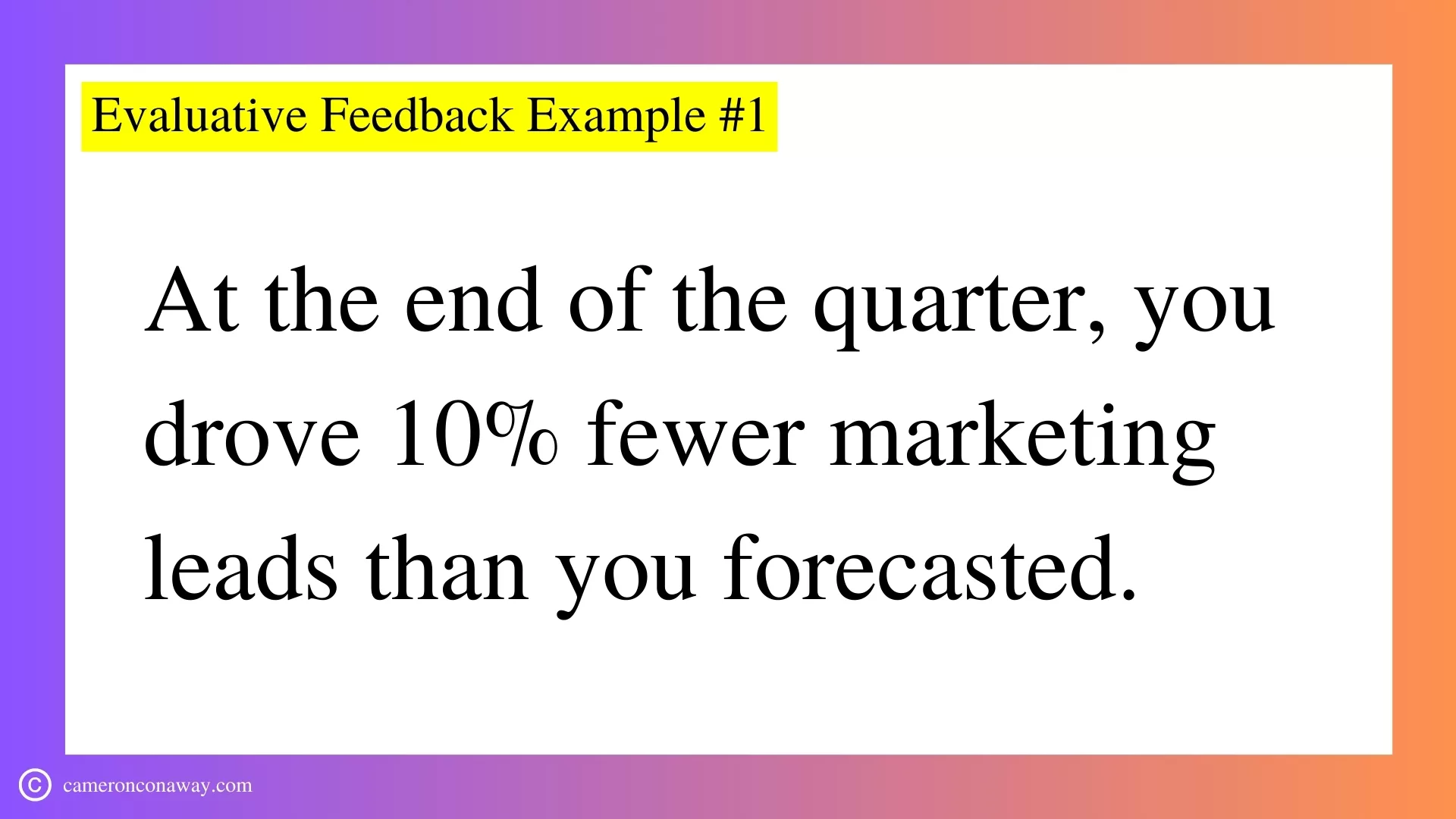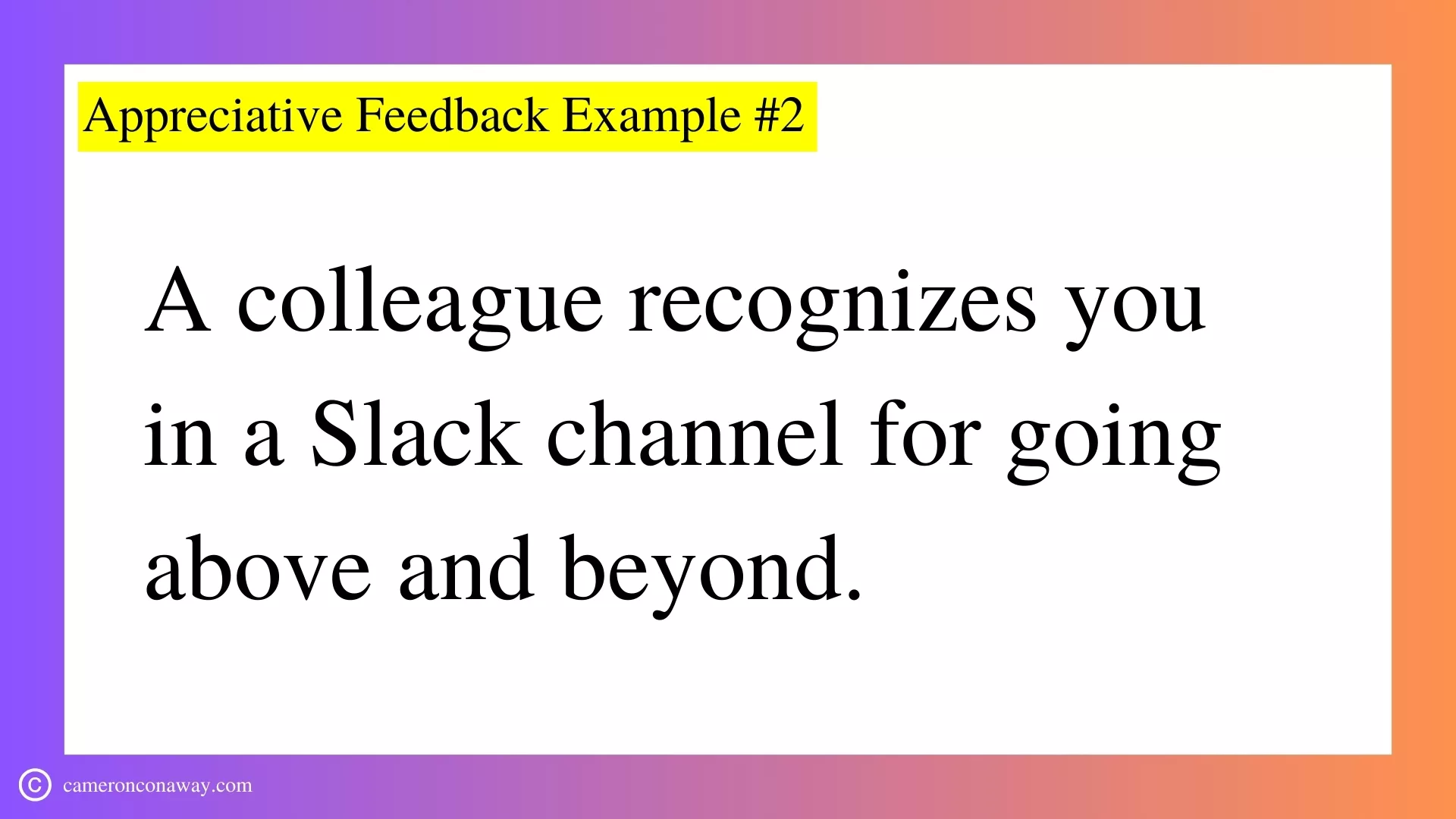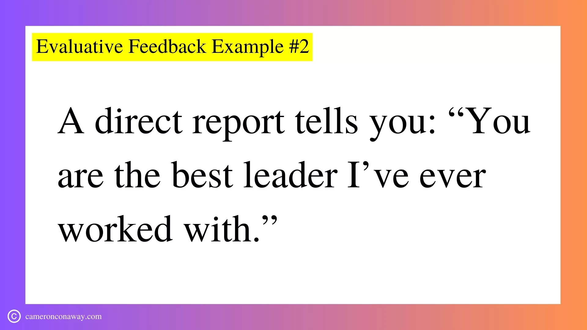 And, lastly, let’s spend some time on the three common feedback forms here. There are many forms of feedback, but I’ve found these three types to be especially helpful in allowing us to easily categorize the most common types. These come from a fantastic book titled Thanks for the Feedback: The Science and Art of Receiving Feedback Well. In my opinion, this is the #1 book about feedback you should have on your shelf if you care about this topic. I’ll link to it in the description. Okay, so you can think of evaluative as like the audience survey we mentioned earlier. This survey let the speaker know how she scored out of a possible 5 points. In this sense, it let her know how she did and where she stands on the scale. Evaluative feedback might also come from a colleague, who provides feedback (positive or negative) about how you did on a particular task compared to how they think it could have gone. Appreciative, as you can guess, is the kind of feedback that makes you feel seen and valued. The coaching feedback type specifically calls out how you might be able to improve. With positive feedback, coaching feedback might be specific and actionable steps you can take to double-down on your strengths. With negative feedback, the coaching feedback type would provide specific and action-oriented tips for how to improve upon what the feedback giver perceives as your areas for improvement. Keep in mind here that, while these three types can be a helpful tool for framing the many types of feedback, feedback can cut across all of them. For example, consider this feedback and see if you can find the three types within it: