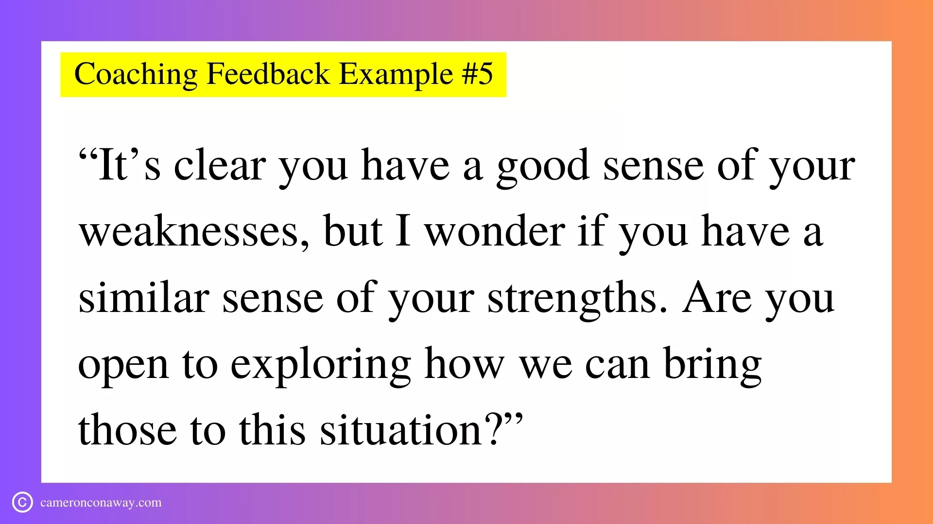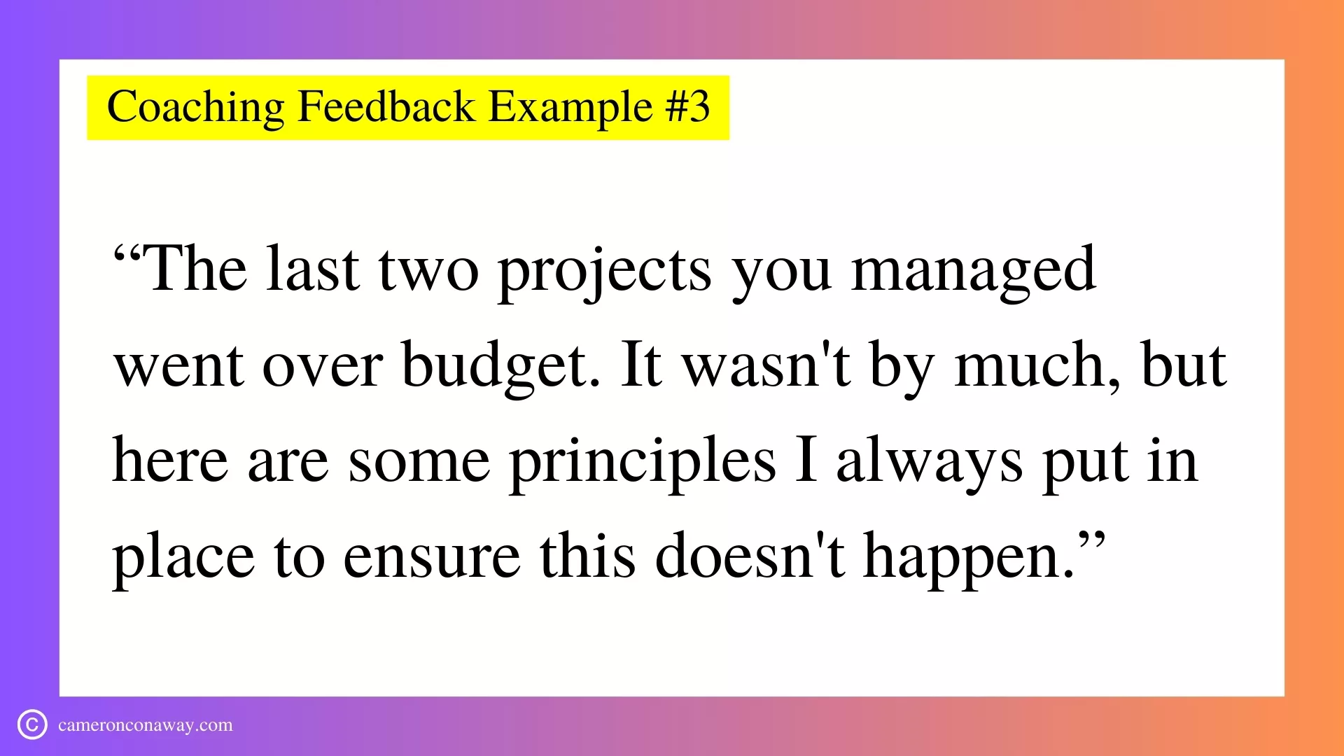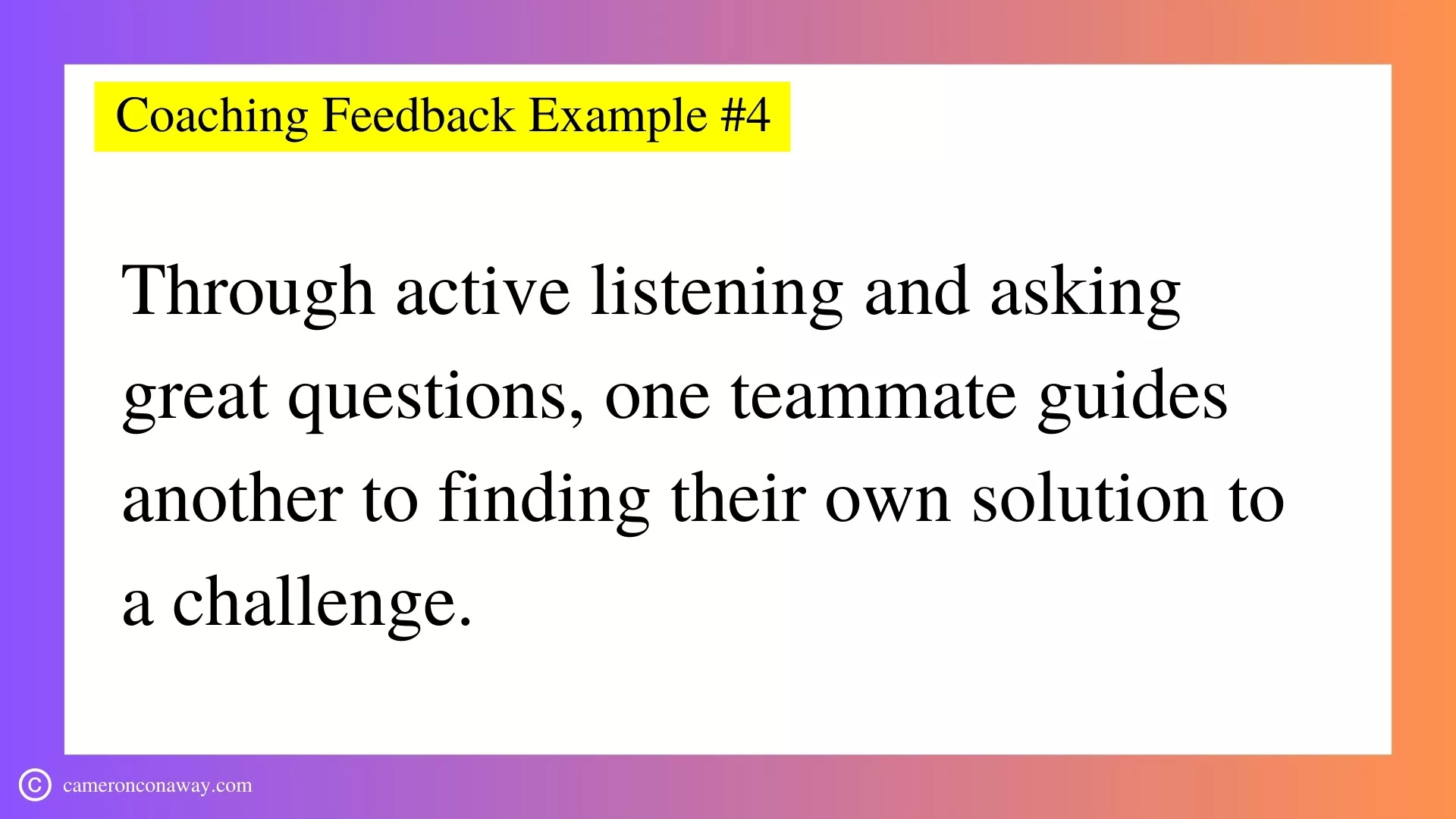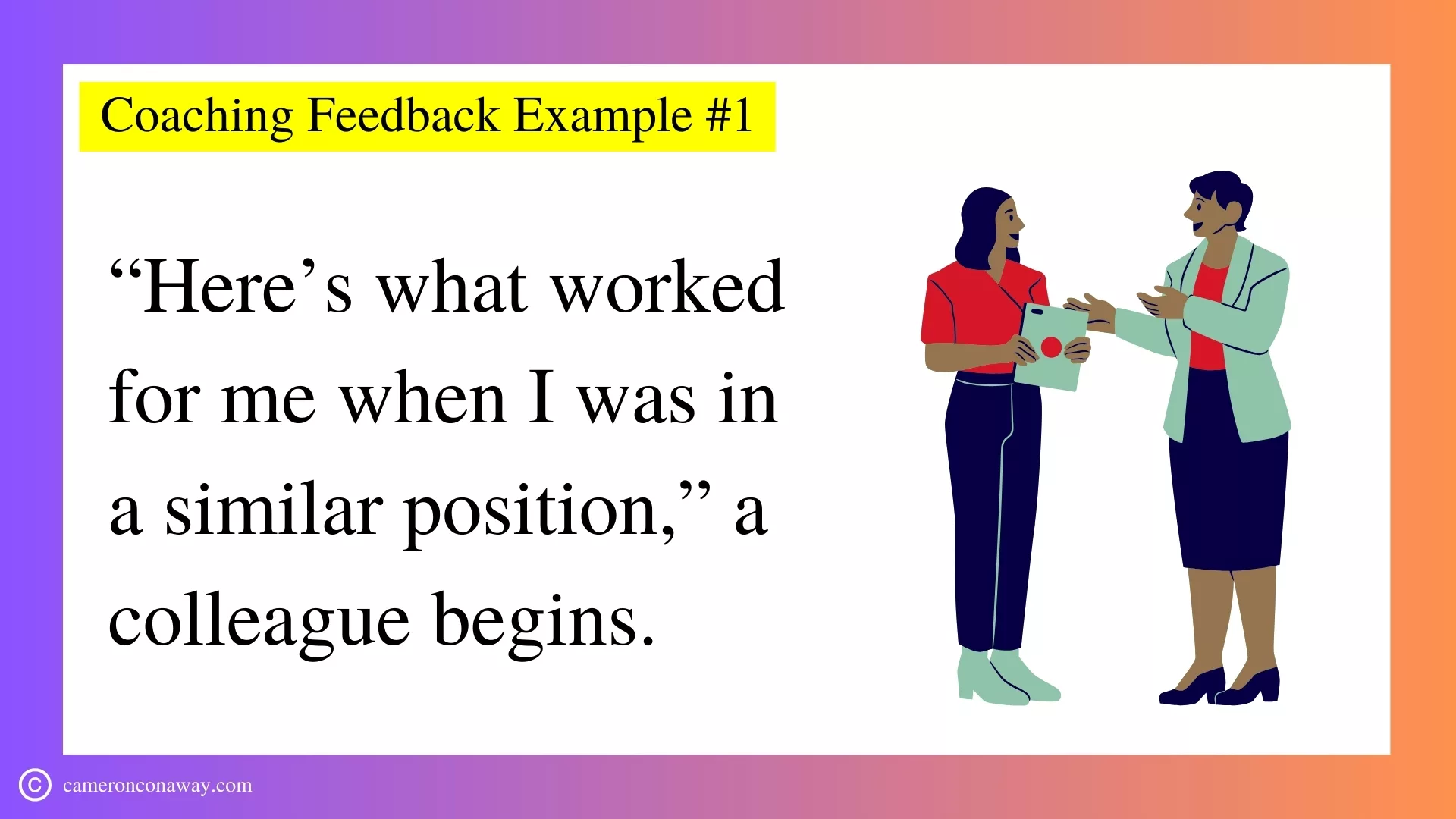 Even if we took the word coach out of this one, this would be an example of coaching feedback. The feedback giver here highlights an area for improvement and pulls both from what they observed (the strength of speaking from the heart) and their own experience in going through some training to offer a way forward on how to improve.