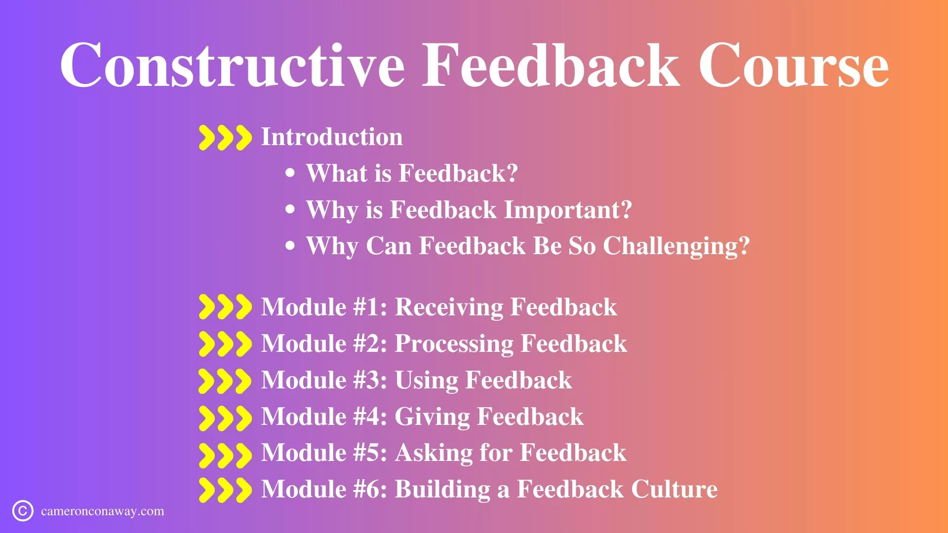 Hi there team, my name is Cameron Conaway and welcome to Constructive Feedback at Work: A Complete Course on the Basics. In this course we will cover the fundamentals of feedback, with a heavy focus on building the practical foundation you need to effectively give, receive, ask for, process, and use feedback. While this is a course on the basics, I don’t want you to be fooled by the term basics. This course applies to everybody everywhere – assuming you are human, and like all humans, are surrounded by feedback. Feedback is both an art and science, and I’ve found that it’s a skill worth continuously developing regardless of where you are in your career.