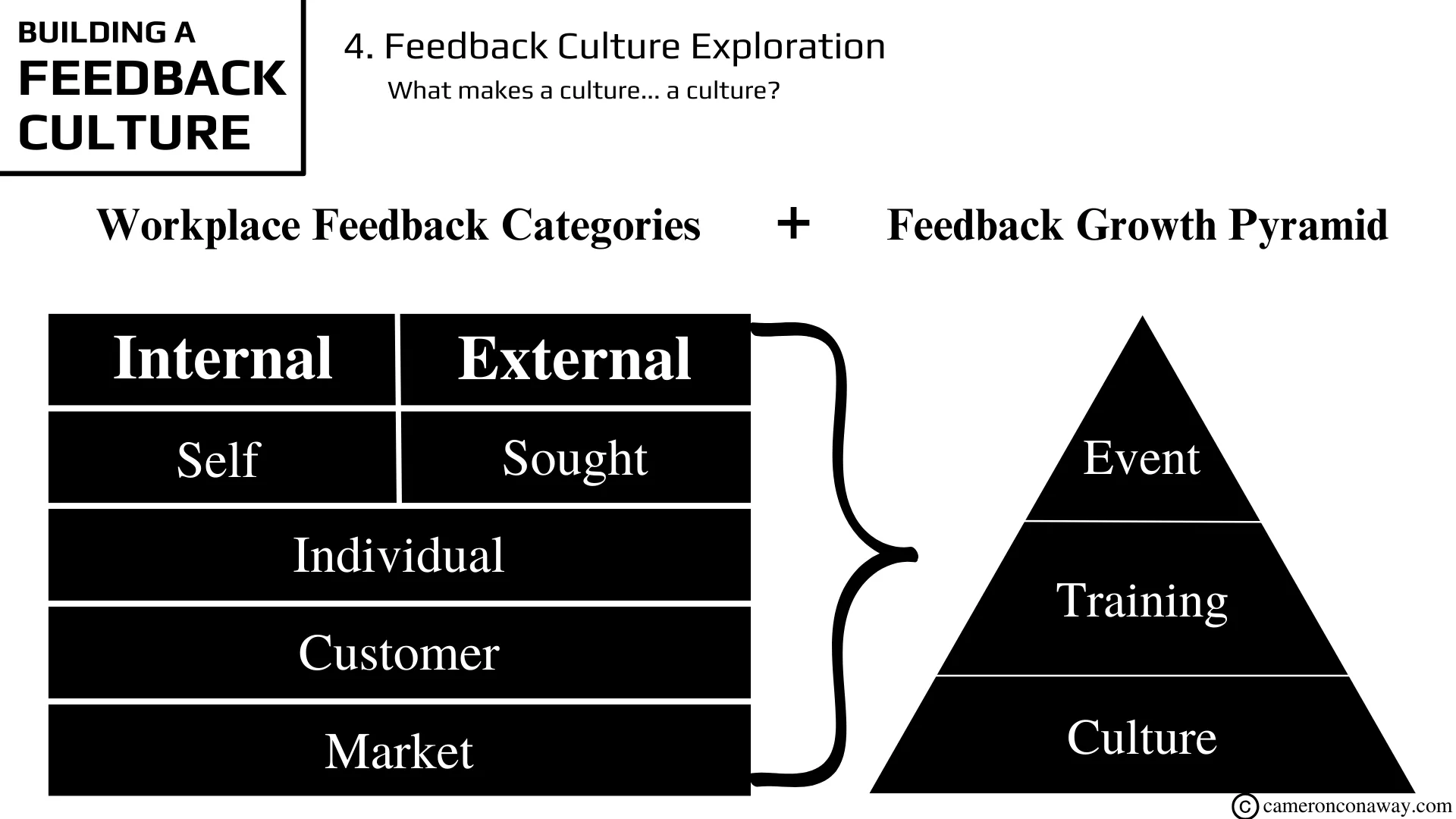 At the Customer level, this could be feedback about some part of your organization that you see posted on public sites like LinkedIn, G2, Yelp, Reddit forums, or elsewhere. Similarly, external market signals could be a result of publicly-known market shifts that maybe haven’t impacted your business yet – such as the Federal Reserve changing interest rates or a tense geopolitical situation that may have an impact on your supply chain strategy. As you see, there can be barriers at every level here. For example, a company may be one of those rare few who offer their employees training on feedback communications, but they may be missing the boat when it comes to having a strategy for listening to the external market signals that could seriously disrupt their business model. Based on my experience and review of the decades of feedback literature, one way to move from feedback category awareness to real action is to pair our category diagram with a Feedback Growth Pyramid – as we have on the left. From here, you can begin to map each category to corresponding growth initiatives… such as… when it comes to collecting External Market Feedback… what’s our culture?