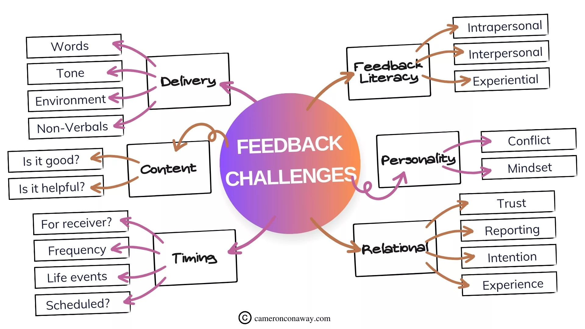 Another area where feedback challenges can occur has to do with Timing. For example, is the feedback receiver-centric… is it given at a good time for the receiver? If the feedback receiver just gave the greatest presentation of their life, rushing the stage immediately after they’ve finished to lay out all the ways they can improve next time might not be the best time. Similarly, waiting months after that presentation to give feedback may not be all that helpful either. And then there’s frequency. So while the feedback may be good, it could be that it’s coming at too great a frequency for the receiver to deal with. In my experience as a writer, I remember receiving rather relentless negative feedback from my professors. It reached a point where I felt hopeless. In this regard, the frequency of feedback was high and it felt especially high considering that the frequency of positive feedback I was receiving was exceptionally low. When one professor pulled me aside to give me some incredibly specific positive feedback, it set my career on a whole new path… all of a sudden I had the confidence and resilience to handle the high frequency of negative feedback.