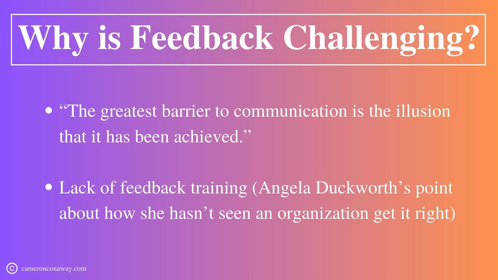 Another reason workplace feedback is challenging is there’s generally a lack of feedback training offered to employees. And, when there is training offered, it splits groups into camps… where people managers get training on giving feedback and individual contributors get feedback on how to receive it. To me, this is but one of many reasons why the quote from Angela Duckworth rings true.