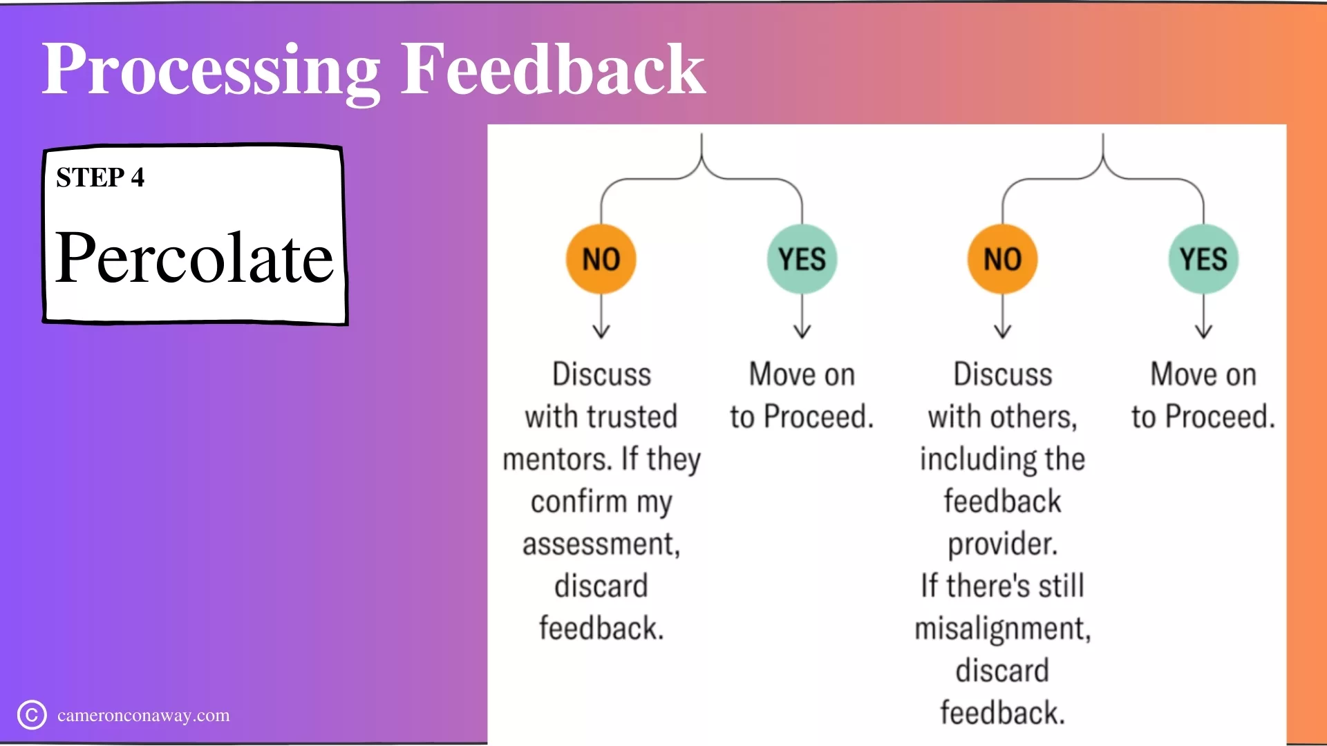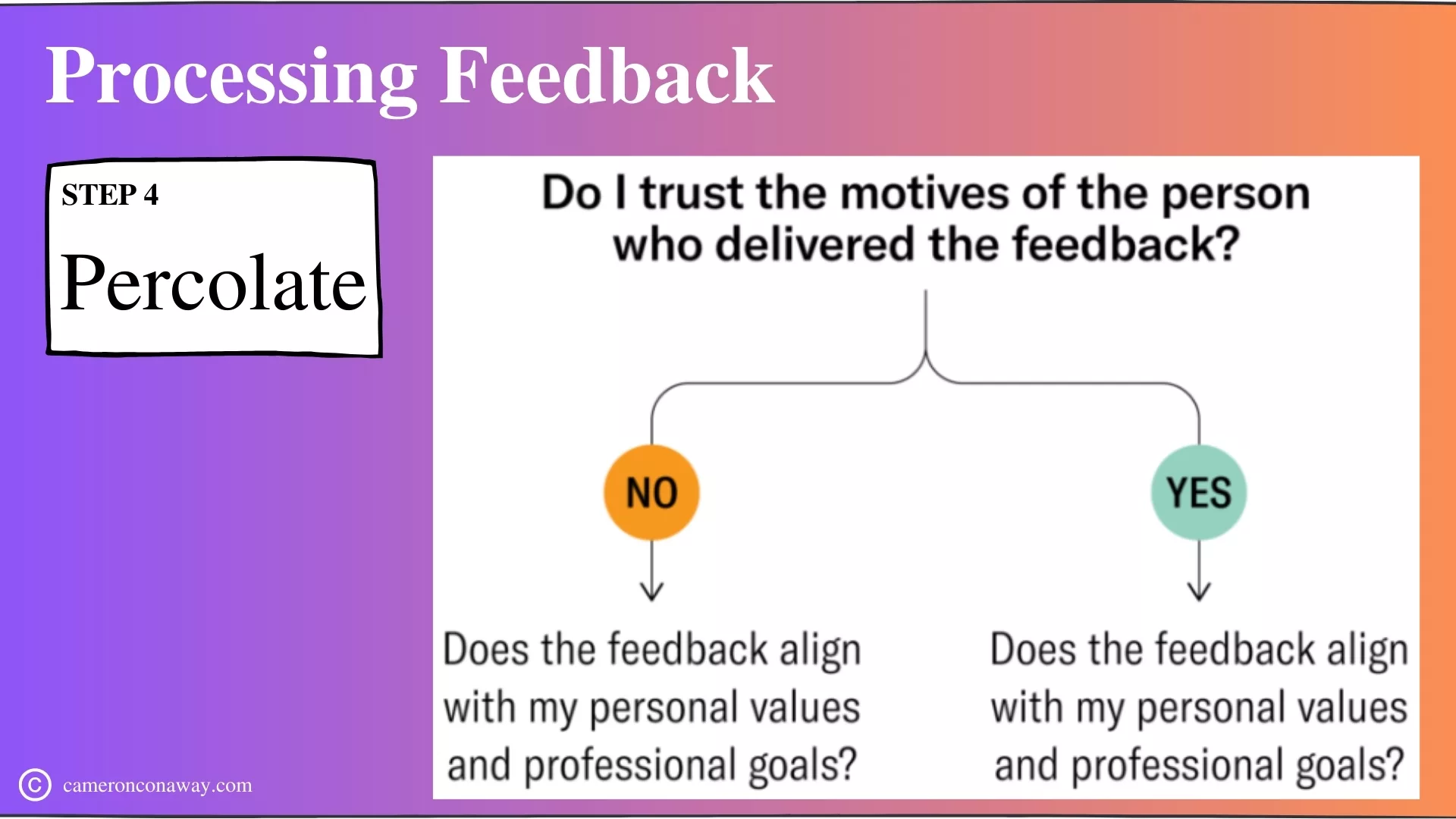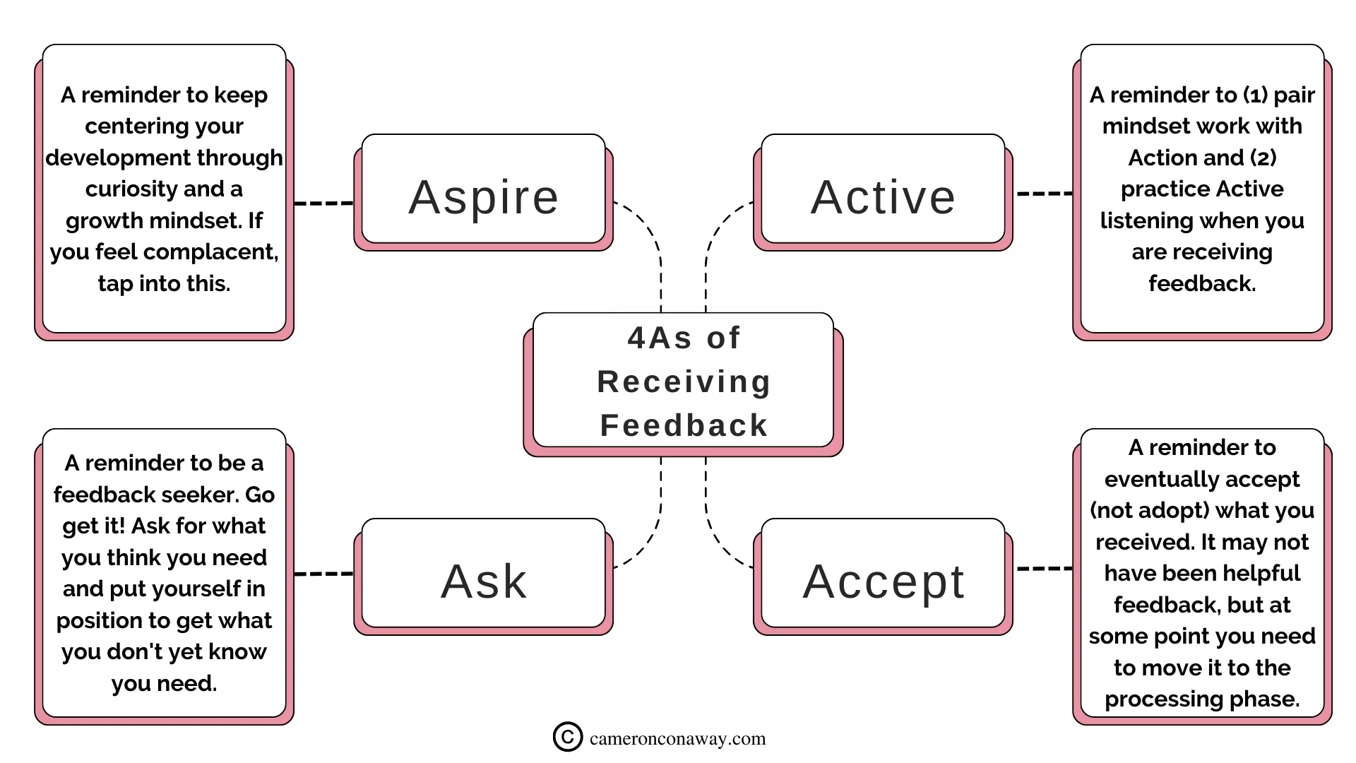 What I mean by processing is… what next steps do we take after we receive feedback? For many of us, our default after receiving feedback is to begin using it, but as I wrote about here, there’s often some important work we should do between the time we receive feedback and then use it that ultimately allows us to make better decisions and ensure we are leveraging feedback in ways that benefit our personal and professional goals.