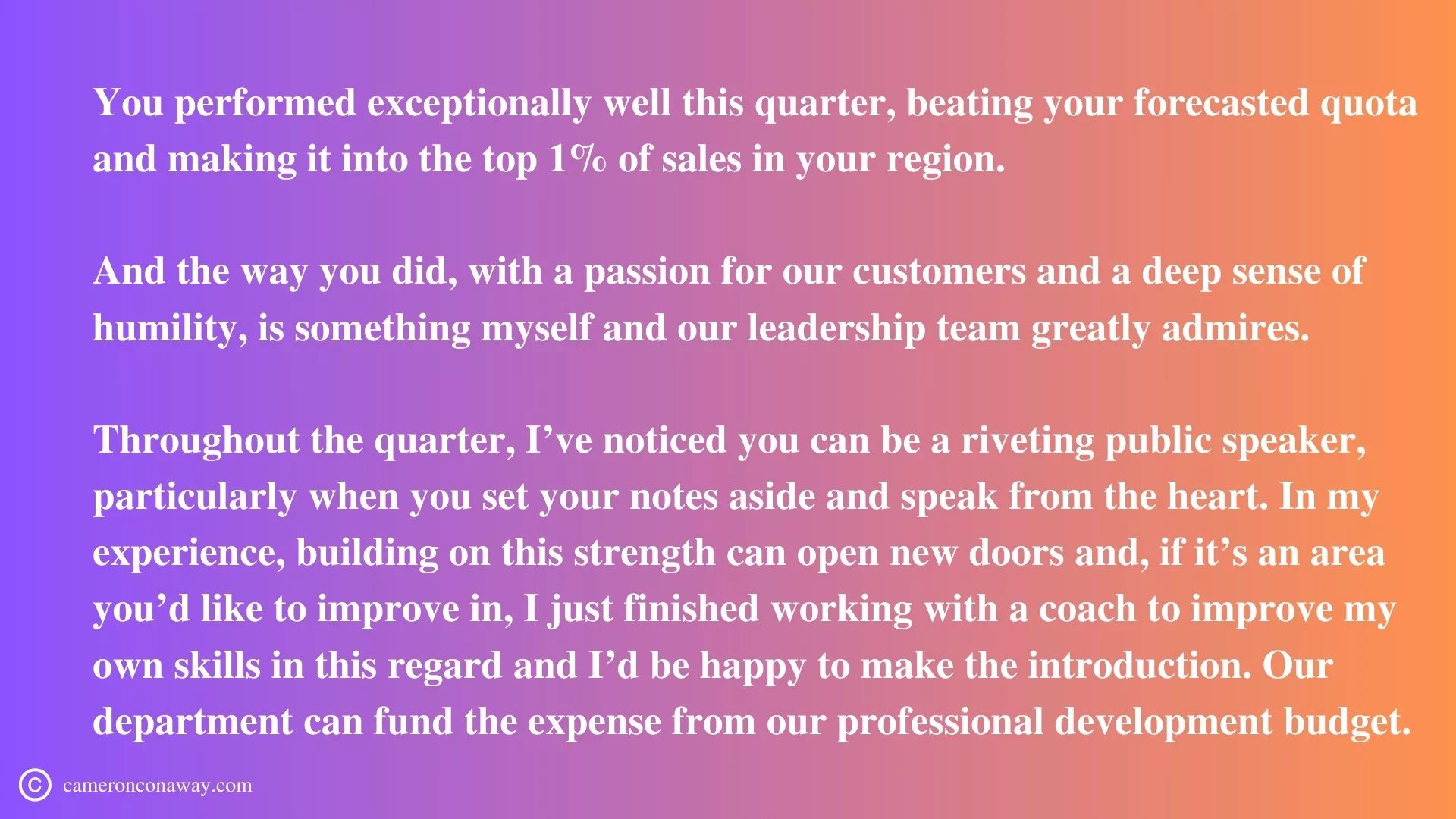 “You performed exceptionally well this quarter, beating your forecasted quota and making it into the top 1% of sales in your region.”