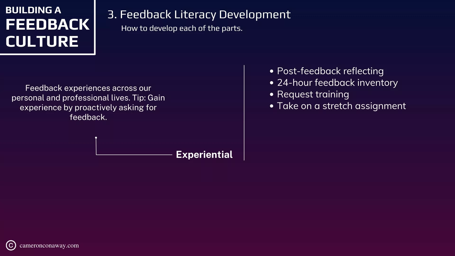 As mentioned here, one way to gain experience, especially in a feedback-averse culture, is by proactively asking for it. This will allow you to see and learn from different feedback delivery styles and practice how you receive and process each. You could also combine this with journaling… perhaps carving out time after you’ve received feedback to reflect through journaling on everything from how you felt to what you learned in the process. It’s only through these kinds of intentional practices that you can see, for example, that your default reaction has always been to get overly defensive upon receiving even relatively minor negative feedback. With this new awareness, you can develop more skillful means – such as perhaps taking a few deep breaths to calm yourself – when you notice the defensiveness arising. And reflecting after feedback can work for feedback givers as well; after giving particularly negative feedback to a colleague (which was hard for me to deliver for several reasons) I found it helpful to reflect through writing on how it went and on how I felt before, during and after. Another way to develop experientially is to do a 24-hour feedback inventory.