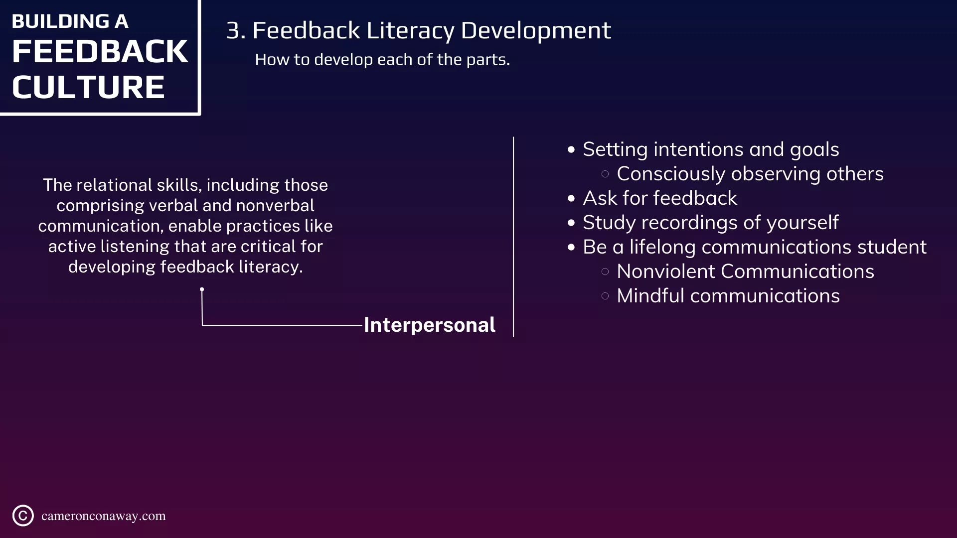 Stories of Kobe Bryant, for example, often highlight how he sought advice and feedback from the greatest basketball players who were still alive at the time he was playing. By all accounts, Kobe stepped into those relationships with curiosity and willingness to learn as a feedback receiver. On the other hand, we may have a feedback giver who wants to hoard their wisdom… they don’t want to give feedback to others because, as they see it, it will help others improve and therefore lower their stock, or level the playing field. As you can see, the mindset you adopt when stepping into a feedback relationship plays a large role here. And our final category could be the overall feedback literacy of those engaging in the feedback process. As discussed earlier, feedback literacy is the overall capacity to effectively give, receive, process, ask for, and use feedback… and, as I’ve come to see it, feedback literacy is built at the intersection of number one, intrapersonal skills… those skills within our own mind, such as self-awareness, open-mindedness and emotional intelligence, number two, interpersonal skills, those relational skills comprised of verbal and nonverbal communication which enable practices like active listening, and, number three, Experiential… meaning the learnings we’ve had throughout the various feedback experiences in our life. As you can see here, a lack of development in intra- or inter personal skills, or a lack of experience entering into healthy and effective feedback relationships, can lead to various issues in communication.