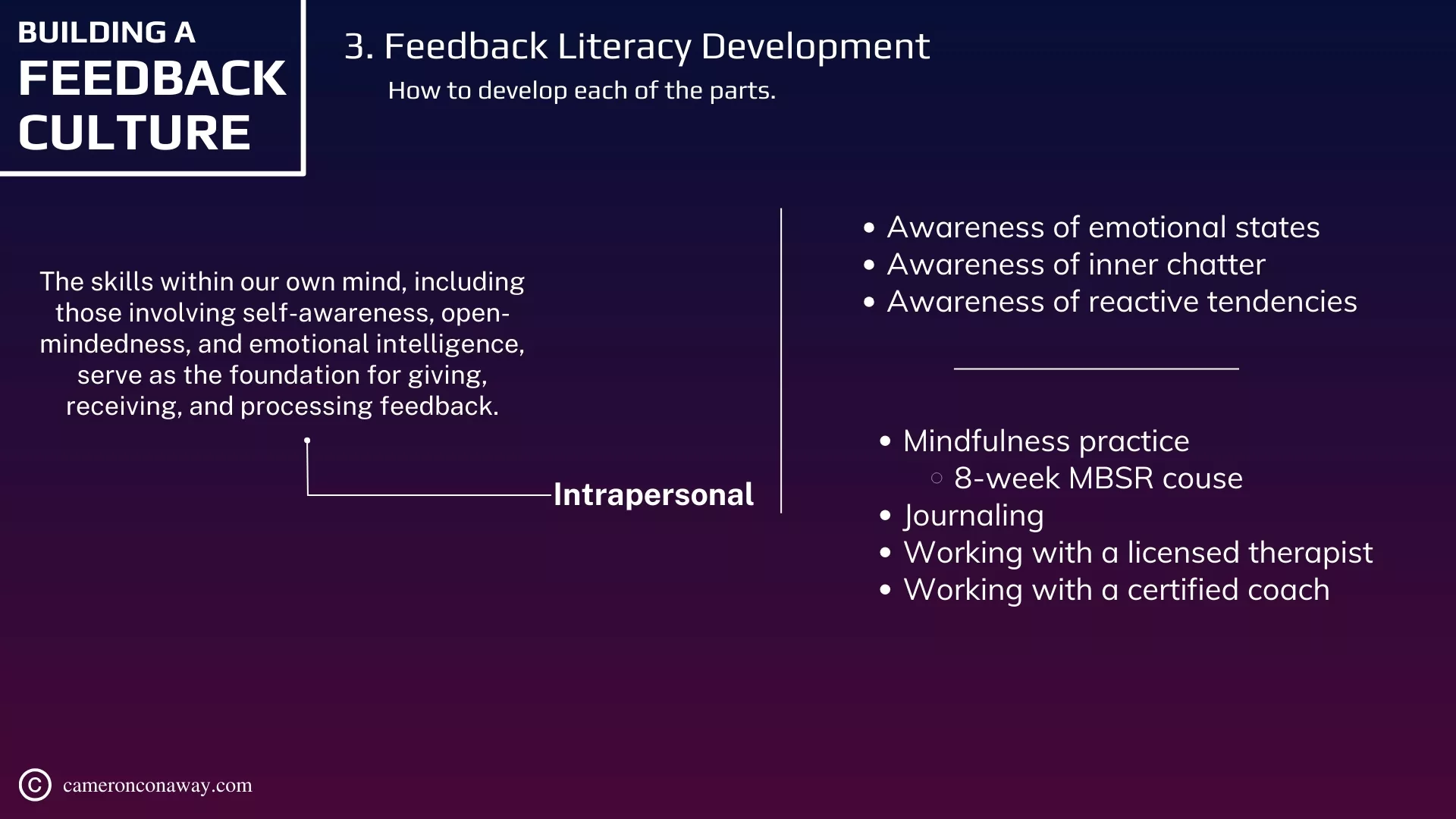 Okay, we can begin with Intrapersonal: Self-awareness is a vital dimension of intrapersonal skills, and self-reflection can effectively build this capacity. Through practice, we can develop a heightened awareness of our emotional states. Improving our ability to recognize and be with (rather than respond to) our own emotions will help keep us receptive and grounded during challenging feedback conversations. More often than we know, our inner emotional states can lead to our behaviors… and, for many of us, we often exhibit those behaviors without having any real awareness of the underlying emotional state. Through awareness-building practices, we can ultimately get a better handle on what we’re feeling, what that feeling feels like, and even what behavior we want to engage in as a result of that feeling. For me, personally, when I am lacking awareness, I tend to rather intensely pick and bite my nails when I have a feeling of uncertainty about something. Also, without awareness, when I’m scared about the health of a loved one, I find my default behavior is to get something to eat… this distracts me from feeling the underlying feelings of fear and listening to what they may have to teach me. As I recently wrote in a blog post, Feelings are trailheads that lead to insight… that is, if we bring awareness to them and gently investigate them, they often lead to insights we wouldn’t otherwise have had access to. We can also bring awareness to our inner chatter, and in doing so, begin to build an inner system of talking to ourselves that better serves us.