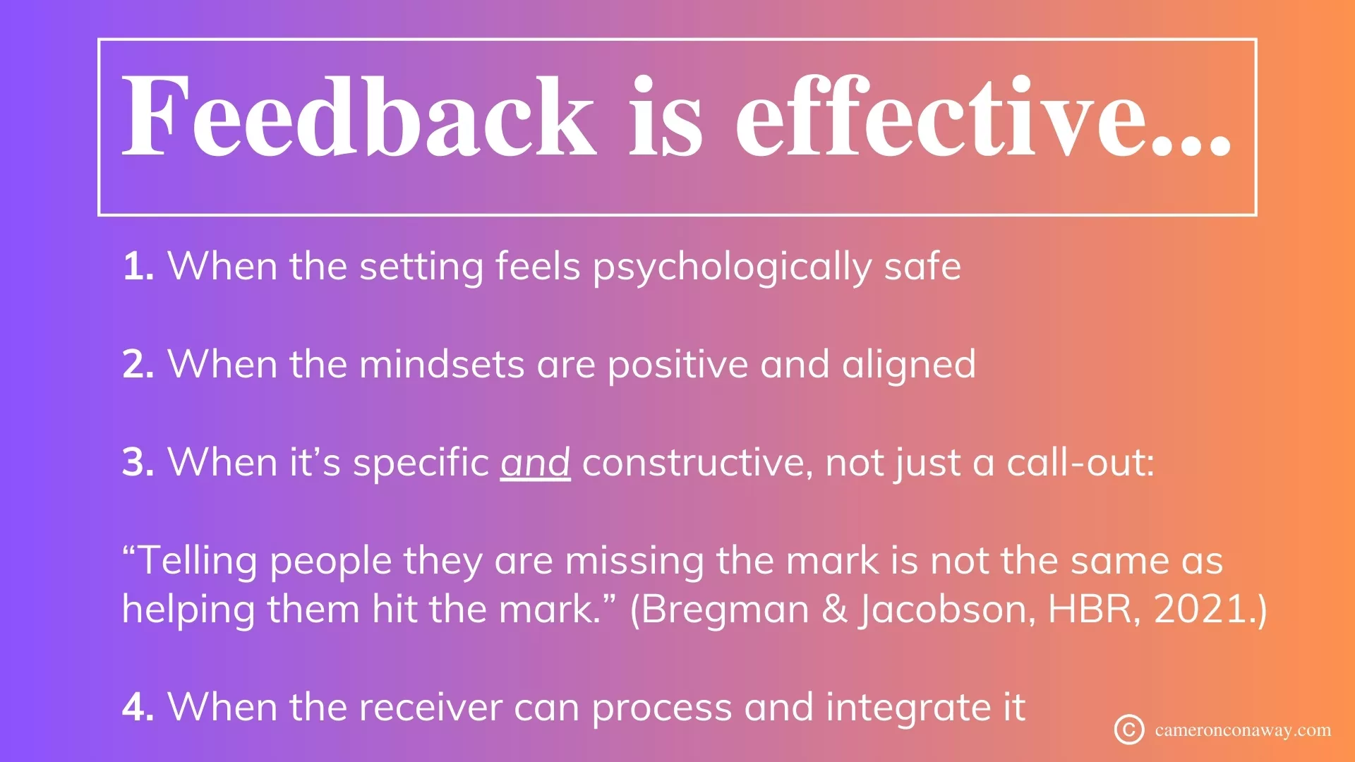 Next up: we have that the purpose of feedback is to be helpful. It should go without saying, but inherent in this is what feedback is not meant to be: it is not meant to ridicule or belittle. It is not meant to embarrass. It is not meant to harm. Those who have the gift of giving feedback will put themselves in a much better position if they do the inner work of understanding their intentions prior to delivering the feedback. By carving out a quiet moment before giving feedback to ask yourself — why am I giving this? — you may uncover some surprising dimensions that show you your intention is not meant to be helpful. I know this because, like you, I am also part of this complex human experience. And we are also part of systems that encourage us to act in certain ways, including ways that may harm others. And, for various reasons, we all come at things with different motivations. So I encourage you to check your intention at the door prior to entering into a feedback conversation.