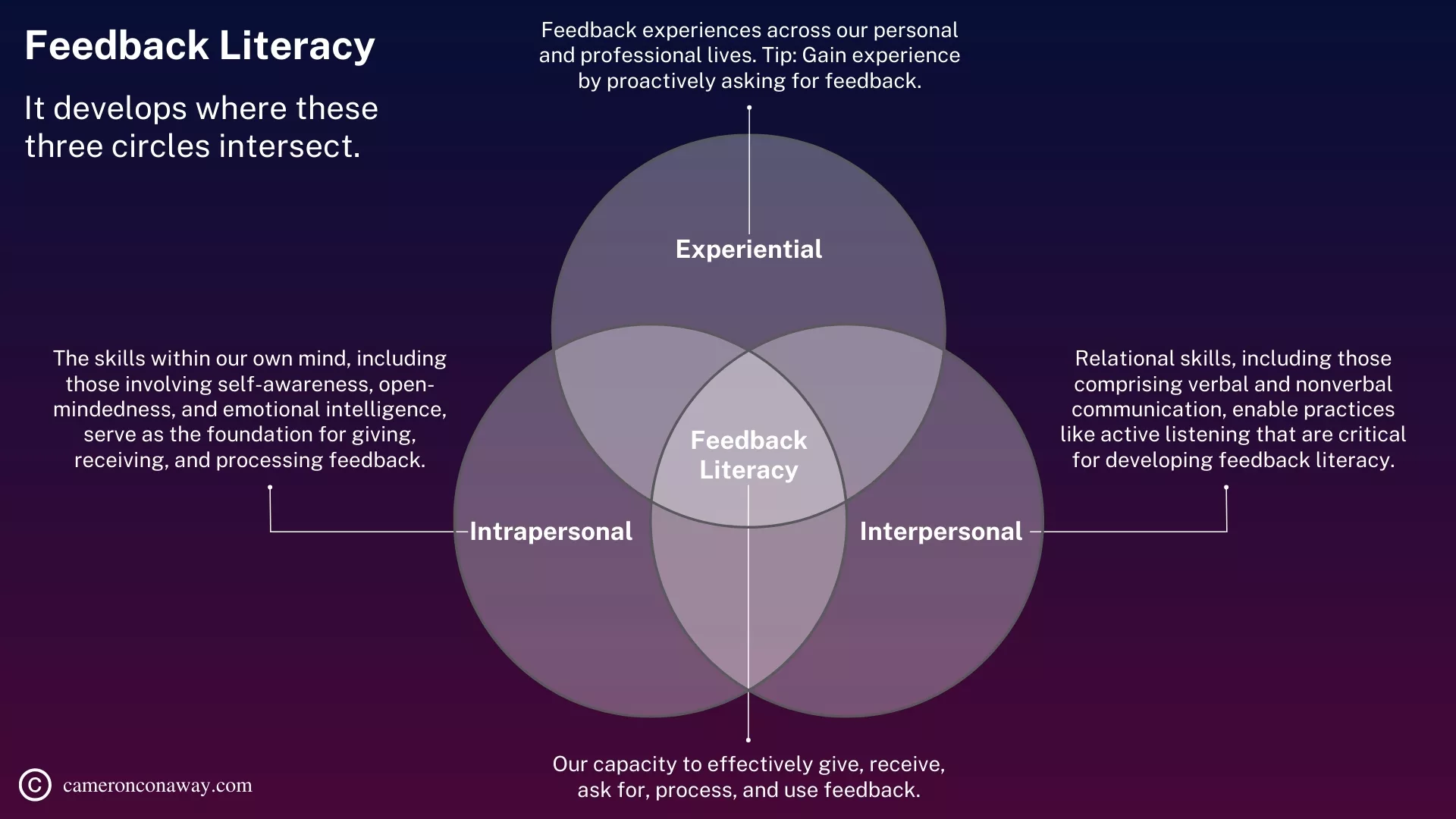 I’ve also found it helpful to provide a brief glimpse into what each area means and then allow the individual to take it to the next level regarding how it might apply to their development. So here’s how we can think about each part of feedback literacy. We start with feedback literacy at the core, as it develops at the intersection of each part. In one part, we have the intrapersonal. This refers to the skills within our own mind, including those involving self-awareness, open-mindedness, and emotional intelligence… how we’re able to bring awareness to and work with our ever-changing emotional states. In this sense, it could be said that the intrapersonal serves as the foundation for how we enter into feedback relationships. In my experience, if things are chaotic in our inner worlds, that will likely manifest in our outer worlds – often in ways we don’t expect. From there, we move to the other side of our venn diagram with Interpersonal. If intra- is our inner and individual state, inter can be seen as the outer and relationship state. Interpersonal refers to the relational skills, including those comprising verbal and nonverbal communication. These enable practices like active listening that are critical for developing feedback literacy. At this point, you may be wondering… it seems there’s a connection between intrapersonal and interpersonal… in that a relatively stable inner state would be needed to engage in authentic active listening. You are correct! These qualities not only feed into feedback literacy, they feed into each other. From there we move to the top of the diagram with Experiential. This is about the feedback experiences we have across our personal and professional lives. As we’ve said, we must pursue meaningful feedback experiences in order to improve not only in our craft but in our feedback capabilities. The primary way we’ve covered to be proactive about this aspect of your development is to ask for feedback wherever and whenever you think you need it. Let’s now move to how we can develop each of these parts. Let’s start with a cleaner view of our diagram and then break it apart.