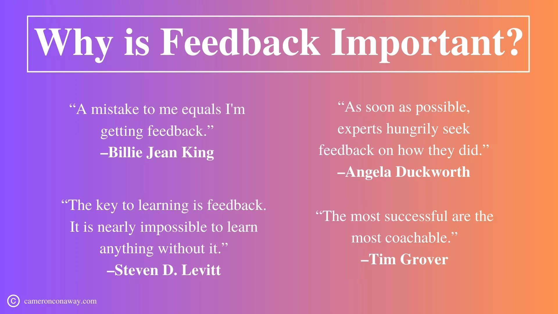 From there, we’ll get into Why is Feedback Important? This also may seem obvious to you, especially after those examples I shared earlier, but it’s worth spending time here because you’re about to make a serious commitment of your time… and, if you’re anything like me, it’s a million times easier to stay committed if you really believe in the importance of what you’re committing to.