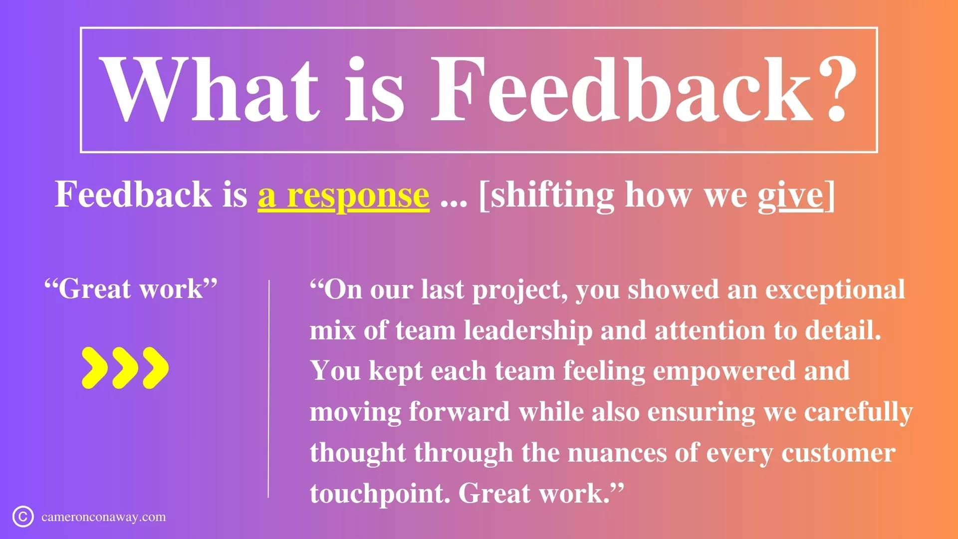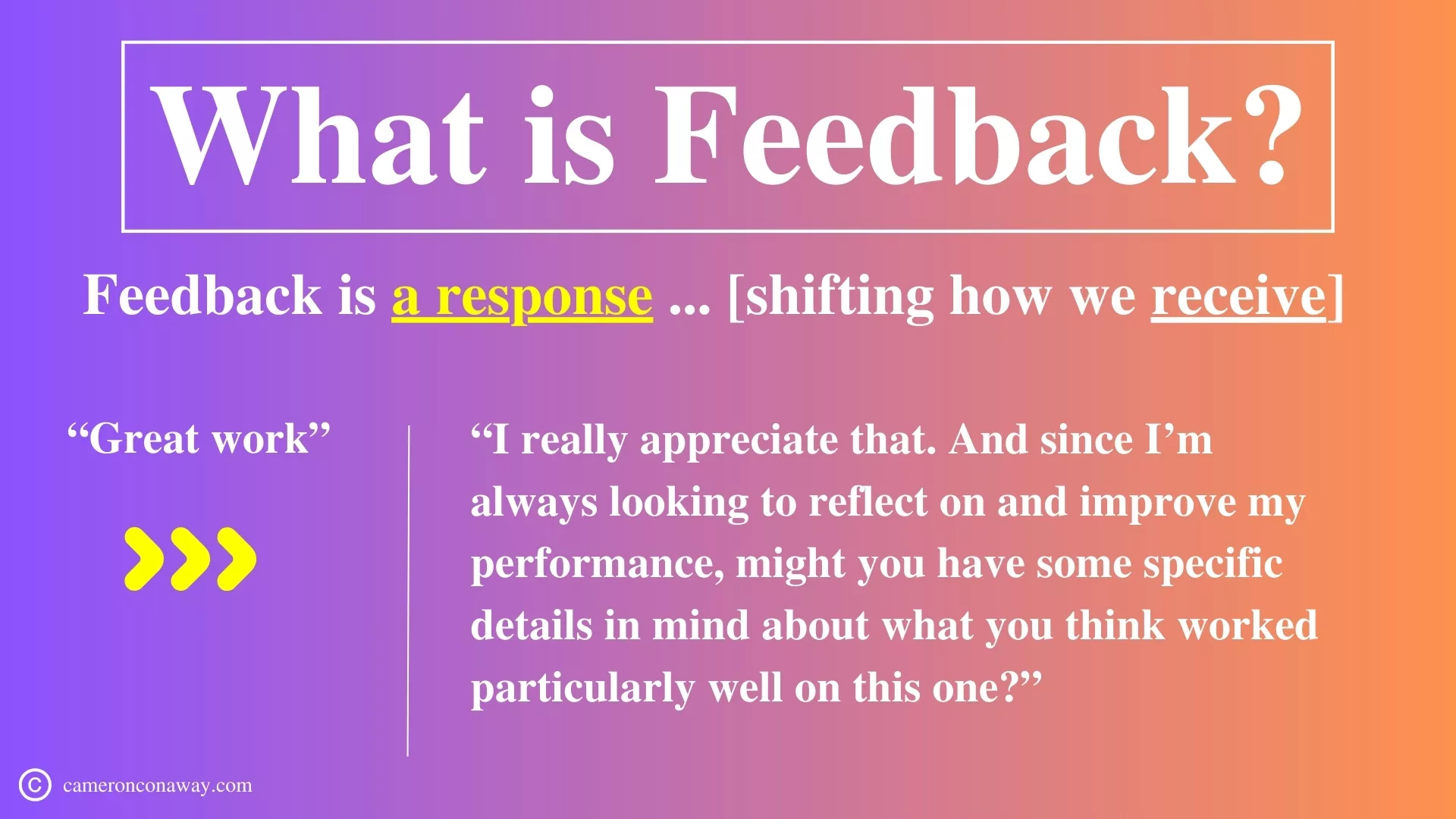 Let’s unpack this a bit. First, we have here that feedback is a response, meaning there was some stimuli — like a behavior or performance — that the feedback was in response to. When giving feedback, it’s important to keep this concept of stimuli and response in mind because doing so will allow you to get beyond making vague feedback statements like “Great work” to something more specific and constructive about the behavior or performance, such as: “On our last project, you showed an exceptional mix of team leadership and attention to detail. You kept each team feeling empowered and moving forward while also ensuring we carefully thought through the nuances of every customer touchpoint. Great work.” Likewise, as a feedback receiver, keeping stimulus and response in mind can help you ask questions if and when you do receive feedback that is too general for you to make sense of. In responding to that “Great work” comment, for example, you might ask something like: “I really appreciate that. And since I’m always looking to reflect on and improve my performance, might you have some specific details in mind about what you think worked particularly well on this one?”