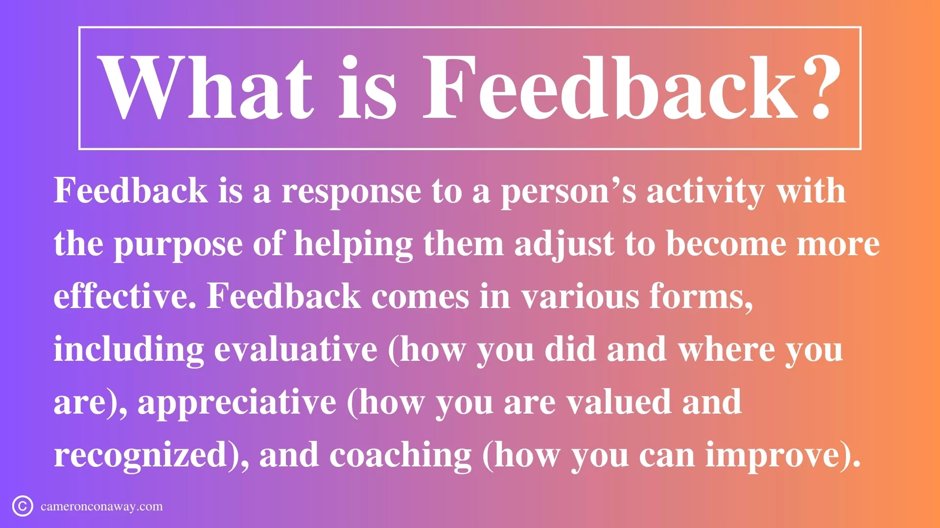 Feedback is a response to a person’s activity with the purpose of helping them adjust to become more effective. Feedback comes in various forms, including evaluative (how you did and where you are), appreciative (how you are valued and recognized), and coaching (how you can improve).